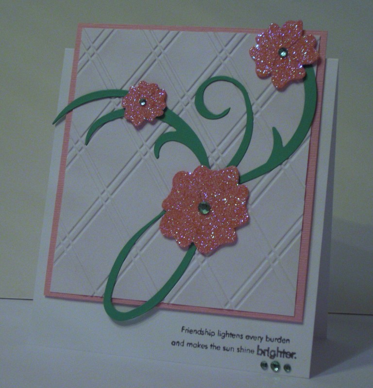 PTI MIM HERE is to glitter your diecuts. Gave me a good excuse to get out my new Sizzix Flowers & Vines #3 that I got on sale & hadn't used. I like spray adhesive to cover large areas to be glittered & it worked great for these flowers. The embossing folder is Sizzix argyle & I used the debossed side. The greeting is from PTI Lovely Leaves set & is such a true saying. My stamping friends have really helped me through difficult times the past year & I so appreciate all of you! Hope you have a great week.