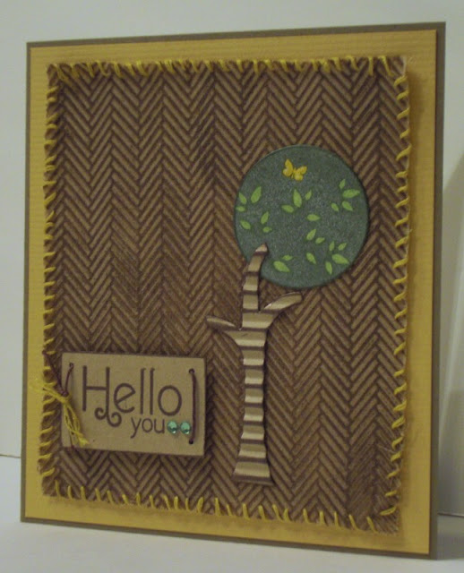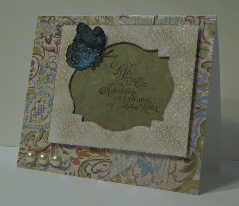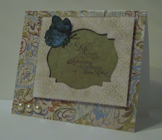 Back from our mini vacation at the lake just in time to work the w/e. We had a great time--gorgeous weather, wonderful clear water for swimming & an awesome cabin (I'd call it a house!) with no one around & a great view! I've missed my crafting time, so today after work while doing laundry & trying to finish our tapes of the Olympics, I also made this card for Flourishes challenge HERE to have 1 more chance to win the August release. Kraft works well with so many colors & I hadn't used blue for awhile. The stamps are both Flourishes--Botanical Bookplates & Taglines. This is the first time I've used the Spellbinders embossing folder & the Just Imagine Crafts little butterfly punch. Thanks for coming by. I'm going to catch up on all your blogs soon!