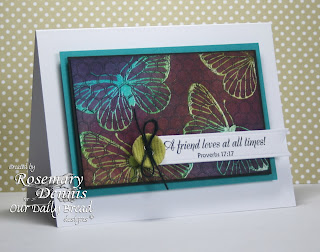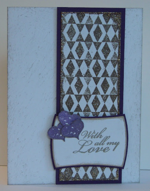 You start by sponging the white cardstock with 2 medium intensity inks & I chose Distress Inks victorian velvet & weathered wood. Then you stamp a background with dark ink. I don't have a Flourishes bg stamp, so I made my bg using an image from the Lace Edges set stamped over & over in rows. I actually got them lined up first try which might be a record for me--LOL! Next step is to clear emboss a solid image & I used the heart from the Fanciful Flourishes set (one of my favs!). Next is the unexpected step: cover the entire piece with a dark ink--I used Distress Ink dusty concord--& wipe off the excess. Voila--isn't it amazing?! I used a sentiment from the same set & it stamped perfectly on the textured cardstock using VersaFine with steady pressure. Flourishes stamps are just wonderful to use, so if you don't have any I'd recommend checking them out. The border punch is MS. Love seeing your comments--thanks for all the encouragement!