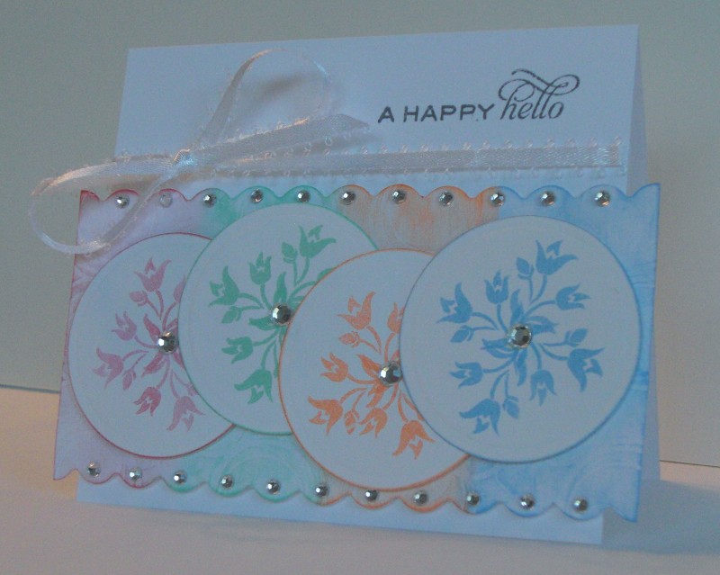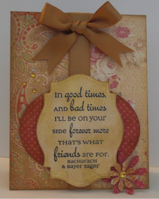 I broke my rule & bought 2 K & Co 12x12 paper pads. Each has 36 double-sided sheets & they were on sale for under $4 each--just couldn't resist! This card is using the sketch from ODBD & papers from the pad called Classic K. I missed the challenge deadline--Yes, I know it was a 2wk challenge--where did the time go?! Oh well, I like how the card came out & I'm going to use it for the August CCC. Hopefully it will appeal to the person who gets it in the exchange. The sentiment panel (ODBD stamp) which started out white is sponged with Distress Inks antique linen & brushed corduroy & is sprayed with gold Shimmer Spritz. I used the same inks to sponge all the edges. The dies are Spellbinders Labels 18 & Oval. The flowers are punched from the same papers using Marvy punches. I really like these gold Sticko gems, so used them for the finishing touch. Isn't this ribbon beautiful? Can't beat Michael's Basic Basic in my book. Thanks for coming by & I hope you've had some fun this weekend.