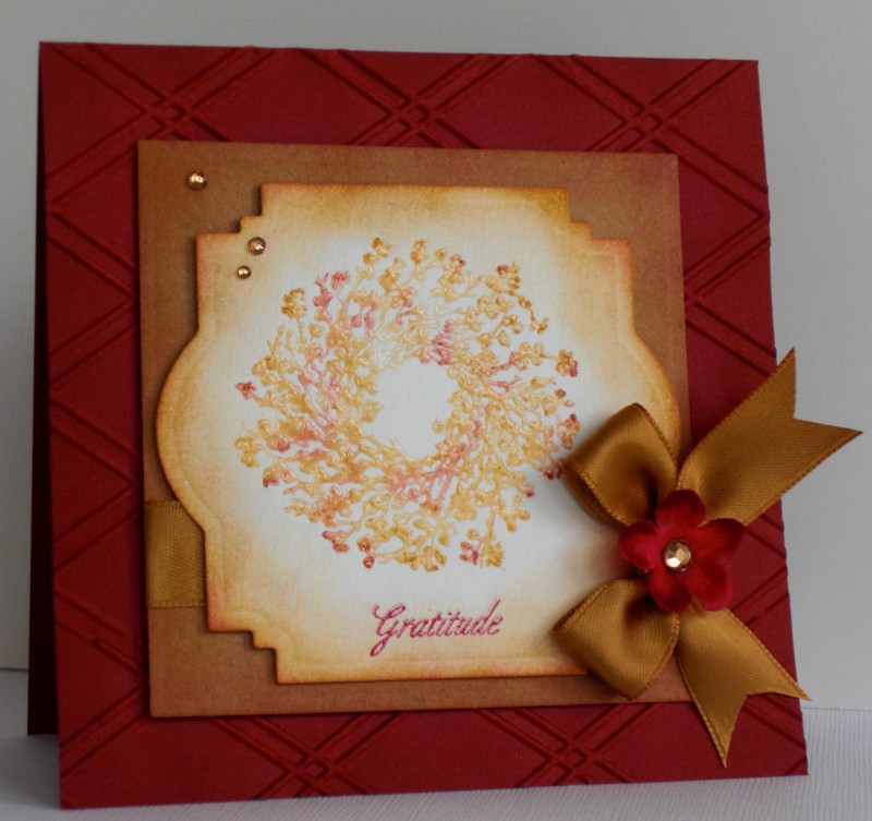 Well, actually I'm sure it isn't new, but I just discovered it--you can emboss a watercolor image! I inked the Flourishes wreath from Wreaths of all Seasons with Memento Peanut Brittle & Rhubarb Stalk, then spritzed with Ink Potion # 9 & stamped on watercolor paper. Immediately I added clear ep & used my heat gun. I really like how it turned out. The sentiment from the same set was first inked with VersaMark & then Rhubarb Stalk so it could also be clear embossed. The dies are Spellbinders Labels 22 & Squares. I admire Elizabeth Allan's use of color & how she often uses multiple colors when she sponges an edge, where as I used to just use one color. For the wreath die cut I used the same colors I stamped with plus Memento Toffee Crunch. I embossed the front of the card with a Sizzix embossing folder & the little flower is another from a sprig I bought for 75% off. The ribbon & gems are from Michael's. I'm entering this card (just in the nick of time--LOL!) into Flourishes Timeless Tuesday challenge to use kraft paper on your card. I usually reach for my other kraft cardstock, but Krafty by Core'dinations goes great with Memento Peanut Brittle & this shade of gold ribbon. Thanks for taking a look at my card & I'd love to hear what you think.