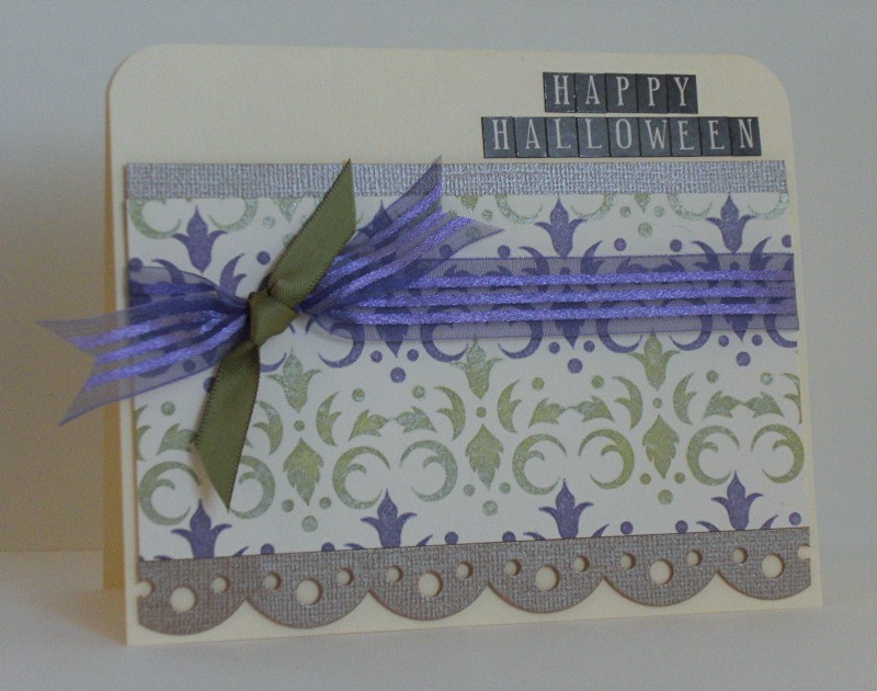 Welcome to my blog! Today I have a card for the DeNami Designs Halloween Blog Hop. You should have arrived from Dana's wonderful blog. I signed up for the hop knowing I wanted to make an elegant, non-traditional card. I used this beautiful DeNami image stamped with Brilliance Encore! Metallic Honeydew & Purple. I've finally learned it's worth taking the time to use my stamp positioner. The shimmery bronze cardstock is edged with Spellbinders Classic Scallop Edgeability that lets you put 2 designs together--love it! The Authentique Petite Type Square alphabet stickers gave me just the look I wanted. Finished the card off with some pretty purple & green ribbons.