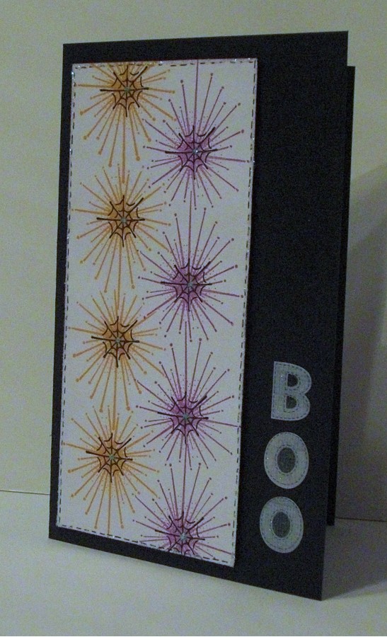 Hello friends. I had a wonderful & very special short vacation to see my sister in California--more on that to come. Amazing how hard it is to get back into the routine. I did post a few cards on Flickr for WCMD. Today's card is a teaser for the DeNami Halloween Blog Hop coming up on Sunday. I used one of my oldest DeNami stamps--the burst, I call it. Started out to just use Halloween colors without a Halloween image, but then I thought it'd be cute to add the little spider web that comes in a set of 4. The inks are Color Box Fluid Chalk in Warm Violet & Tangerine. I added some faux stitching to go with the sparkle stickers & used crystal Stickles around the edges & in the centers of the webs. The panel is popped up. I really like how this turned out--what do you think?Also wanted to remind everyone of the challenge to celebrate my 100th post HERE. I'd love to have you enter a card & the deadline is Saturday midnight Pacific time. I'll post pictures of all the entries & the winner as determined by my hubby on Monday, Oct. 15. I love the cards that have been entered so far! Hope your week is going well. Thanks for stopping by.
