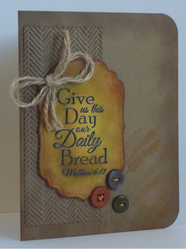 So glad I finally got a card made for the weekly ODBD challenge. I started by just knowing I wanted to use the "Our Daily Bread" stamp set & my Cuttlebug herringbone embossing folder. I ended up happy with the result. After heat embossing the verse I inked the Labels 4 Nestie with Distress Inks scattered straw, wild honey, peeled paint, aged mahogany & fired brick. All edges & the embossed piece are inked with gathered twigs. The wheat is stamped in wild honey several times in the corner without reinking. I popped up the diecut & added a twine bow & some buttons.