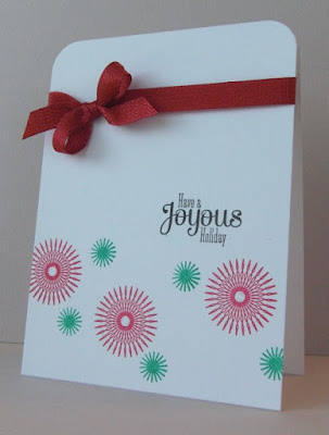 Simple stamping in Brilliance red & green inks resulted in a one layer CAS card. I did add Frosted Lace Stickles to the red centers & the beautiful textured ribbon does keep it from being flat, but I think it's worth it.