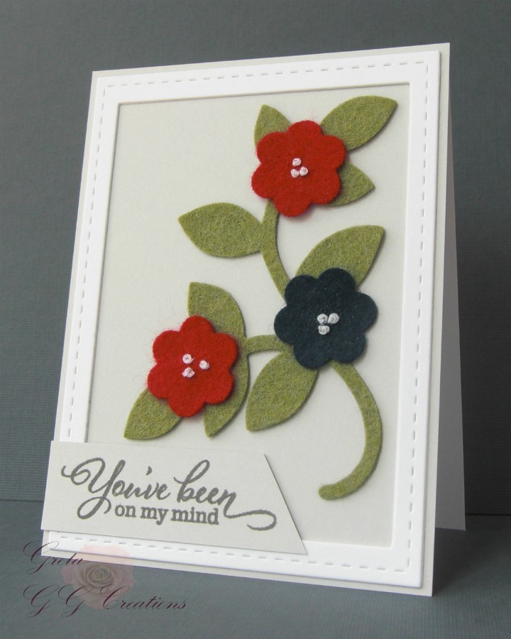 The floss I used was pink for the red flowers & light blue for the blue ones, even though it looks white. Fun to use some of my felt again which I glued to a panel of PTI Soft Stone. The flowers are Friendly Flowers & the leaves are Lovely Leaves. The sentiment from Friendly Flowers was stamped on a scrap of Soft Stone in Versafine Smokey Gray. I cut the white stitched frame twice to make it a little thicker & love how it looks with the Soft Stone. I already have a friend in mind to mail this to. I'm also entering at Dies R Us & Word Art Wednesday. Thanks for taking time to stop by--enjoy the hop!