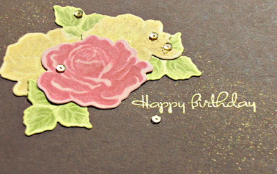 My favorite W&W hello die was stacked 3 high & brushed with Wink of Stella. I stamped the bloom from In Bloom: Frenchy's Festive Florals with VersaMagic Red Magic. I decided against the white border, so trimmed the die cuts with scissors & added more ink with an applicator. The white dots in the centers were covered with black Nuvo drops by using a pointed toothpick. The tricky part was figuring out exactly where to stamp the branches from the same set using pumice stone & ground espresso. Two blooms were glued flat & the third one was attached with foam tape. I'll use this for a winter note card. I'm also entering Inkspirational & SSS Wednesday. Thanks so much for taking time to stop by.