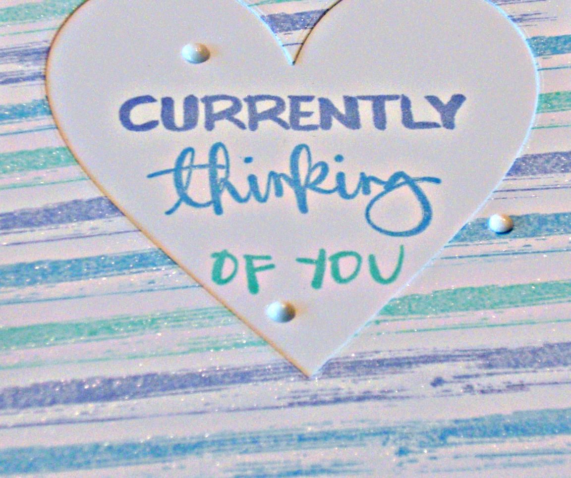 I stamped the image at an angle using Brilliance Pearlescent Lavender, Sky Blue & Jade. Then I die cut a heart from the panel to show my sentiment. Really love the mix of fonts! I finished it off with white Nuvo drops & clear Wink of Stella on the stripes.