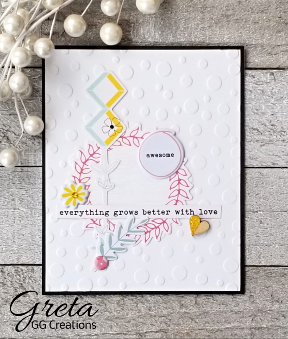 Would never have thought to use a black circle frame behind my green wreath which I made with a branch die from Altenew Layered Floral Elements. The little blue arrangement is made with the same die cut down & combined with another one from the same set. The word is from W&W Frenchy's Festive Florals & the background is Altenew Pegboard Canvas Cover Die.