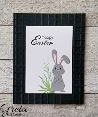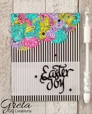 The purple textured scrap was also on my table & this time I remembered that Helen had stamped foliage in black before adding her flowers & leaves. I used PTI Turning a New Leaf & absolutely love how it looks! The black embossed sentiment is a very old one by Stampendous & I'm not sure it had ever been used. The panel was matted with black cardstock & I added gold sequins. I'm entering
